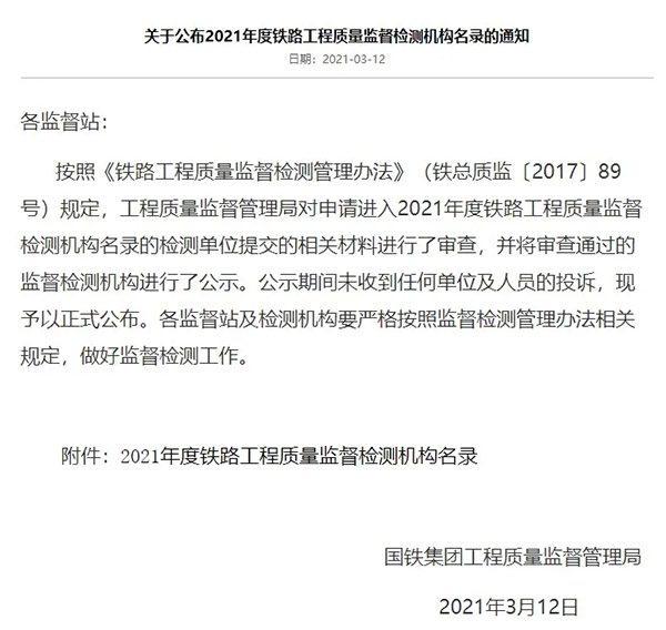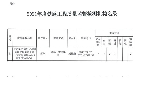 近(jin)日(ri),鐵路(lu)集(ji)團(tuan)有(you)限公(gong)司工程質(zhi)量監(jian)督(du)管理局發布(bu)(bu)了《關于公(gong)布(bu)(bu)2021年(nian)度(du)鐵路(lu)工程質(zhi)量監(jian)督(du)檢測機構名錄的通(tong)知》,并將滿足(zu)合格(ge)條(tiao)件(jian)的91家監(jian)督(du)檢測機構進(jin)行公(gong)示,中(zhong)鋼集(ji)團(tuan)鄭州金屬制品研究院(金屬制品質(zhi)量監(jian)督(du)檢驗中(zhong)心(xin))再(zai)次(ci)上(shang)榜入圍,這標志著中(zhong)鋼國檢的工程檢測能力得到了高度(du)認可。