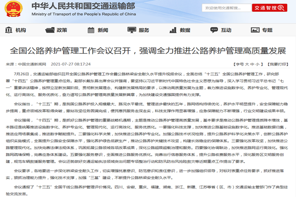 7月26日,交通運輸部(bu)組織召(zhao)開全(quan)(quan)國公(gong)路(lu)養護(hu)(hu)管(guan)理(li)(li)工作會(hui)暨公(gong)路(lu)橋梁(liang)安全(quan)(quan)耐久水平提升視(shi)頻會(hui)議,全(quan)(quan)面(mian)總(zong)結“十三(san)五”全(quan)(quan)國公(gong)路(lu)養護(hu)(hu)管(guan)理(li)(li)工作,研究部(bu)署“十四五”公(gong)路(lu)養護(hu)(hu)管(guan)理(li)(li)重(zhong)點任務。副(fu)部(bu)長戴東昌出席(xi)會(hui)議并強(qiang)調,要(yao)堅持以(yi)習(xi)近平新(xin)(xin)時代(dai)中國特色社會(hui)主義思想為(wei)指導,深入學習(xi)貫徹習(xi)近平總(zong)書記“七一”重(zhong)要(yao)講話精神,按照立足新(xin)(xin)發展(zhan)階段(duan)、貫徹新(xin)(xin)發展(zhan)理(li)(li)念、構建(jian)新(xin)(xin)發展(zhan)格局(ju)的要(yao)求(qiu),以(yi)推動(dong)高(gao)質(zhi)量(liang)(liang)發展(zhan)為(wei)主題,著力推進(jin)設(she)施(shi)數字化(hua)、養護(hu)(hu)專(zhuan)業化(hua)、管(guan)理(li)(li)現代(dai)化(hua)、運行高(gao)效化(hua)、服務優(you)質(zhi)化(hua),奮力譜寫公(gong)路(lu)養護(hu)(hu)管(guan)理(li)(li)高(gao)質(zhi)量(liang)(liang)發展(zhan)新(xin)(xin)篇章,為(wei)加快建(jian)設(she)交通強(qiang)國提供(gong)有力支撐。